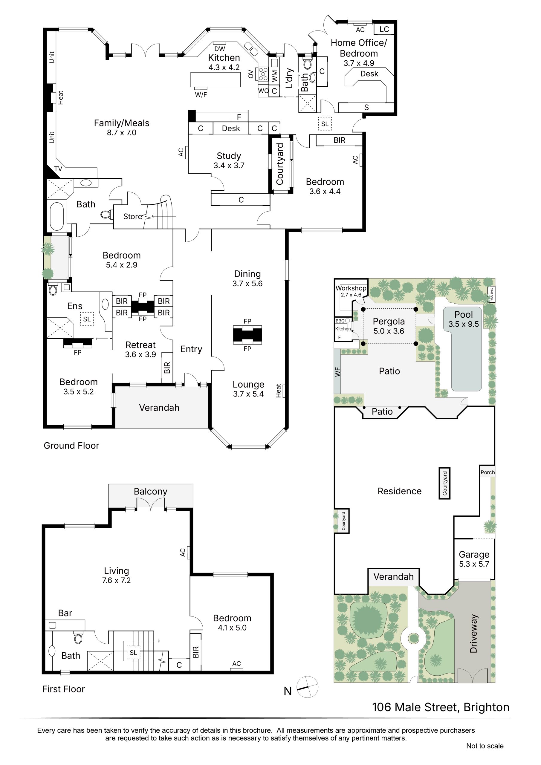 Ground Floor: the main suite enjoys garden views, a large dressing area, plus an ensuite bathroom. Also on this level are two further superb double bedrooms – one opening to a light-well courtyard where the original Hawthorn brick is made visible. A two-way bathroom, additional bathroom plus powder room service downstairs, which also comes with two full studies (one with views of the pool).